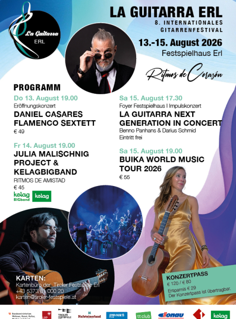 La Guitarra Erl 2026 lädt dazu ein, die Rhythmen des Herzens zu entdecken, neue musikalische Horizonte zu erleben und die verbindende Kraft der Musik zu feiern.